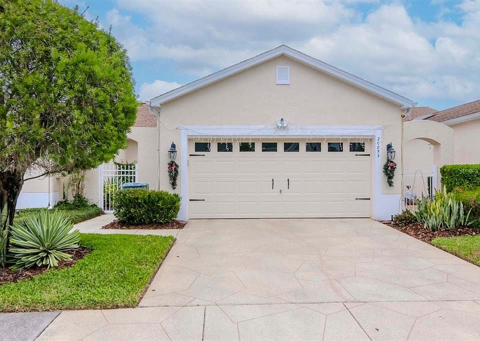 Incredible Value at The Groves! Pack your bags and get ready to move into this stunning 2-bedroom, 2-bathroom villa with a 2-car garage, located in the prestigious 55+ gated community of The Groves Golf & Country Club in Land O’ Lakes, FL. This villa is truly move-in ready and can be sold furnished or unfurnished—your choice! If you love the beautifully curated furnishings, they can stay, making this a true turnkey opportunity. Prefer a blank slate? No problem—the home can be delivered unfurnished. Plus, an Ezgo Golf Cart (48-volt system with new batteries replaced in 2022) is included! Used primarily as a second home, this home has experienced minimal wear and tear and has been meticulously maintained. As you approach, you’ll be greeted by a private courtyard entrance featuring beautifully coated concrete floors (2018) and a charming front porch that sets the tone for the elegance within. Step inside to a spacious, open living and dining area, complete with an elegant tray ceiling and crown molding. This inviting space flows seamlessly to an extended screened lanai with a solid roof, offering breathtaking views of a peaceful conservation area—perfect for relaxing or entertaining. The expansive kitchen boasts a breakfast nook and a large peninsula, making it ideal for casual dining or hosting guests. The split floor plan ensures privacy, with the primary suite offering serene conservation views. The en-suite bath features a dual vanity and a spacious walk-in closet. On the opposite side of the home, the second bedroom is conveniently located next to a full bath with a bathtub. A generously sized laundry room with extra storage enhances the home’s functionality. This villa is packed with upgrades, including fresh interior paint (2019), vinyl plank flooring in the living/dining areas and second bedroom, hurricane-proof insulated windows (Nov 2022), upgraded toilets, kitchen sink, faucet, and bathroom faucets, a new roof (2019), and recently refreshed exterior paint. The Groves is a vibrant, active community that offers an unparalleled array of amenities, including golf, tennis, pickleball, bocce, shuffleboard, yoga, aerobics, a gym, a community pool, and more. Residents can enjoy social activities like karaoke, bingo, and card games, or explore the dog parks, butterfly garden, and vegetable garden. The clubhouse features a full-service restaurant open seven days a week. Your HOA fee includes Spectrum Internet & TV, lawn maintenance, access to all community amenities, a new roof every 17-20 years, and exterior paint every 7-10 years. The Groves is pet- and golf cart-friendly and conveniently located near banks, hospitals, supermarkets, nail salons, and restaurants. Tampa International Airport is just 30 minutes away, and pristine beaches are only 40 minutes from your doorstep. Best of all, residents own and operate the community amenities—including the golf course! Don’t miss your chance to own this move-in-ready gem with one of the best values in the community. Call today to schedule your private showing!