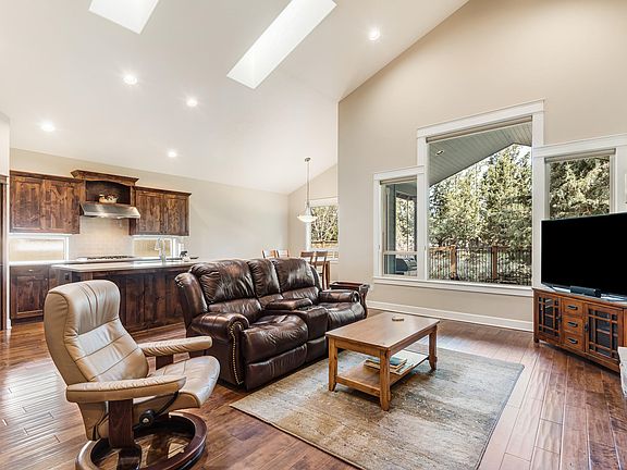 Beautifully maintained single level Pahlisch home is located in The Bridges of Shadow Glen. Entering through a covered porch, your eyes are drawn to a wall of windows upon your first steps inside. Decorative stone archway brings you into a vaulted Great Room with skylights providing more natural light. A Stone surround fireplace with hearth and engineered wood flooring, tying it all together. 3 Bedrooms are separated with privacy hall to primary. Vaulted primary bedroom has door onto patio, coffered and lit ceiling. Primary bath with soaking tub, glass surround shower, larger walk-in closet. Light and bright Junior suite off entry with full bath. All Appliances remain in the home. Custom blinds throughout. Double garage is insulated, The Large covered patio, is set to provide you privacy, and nature's views. Enjoy the amenities of The Bridges, the location, the Life in Central Oregon.
