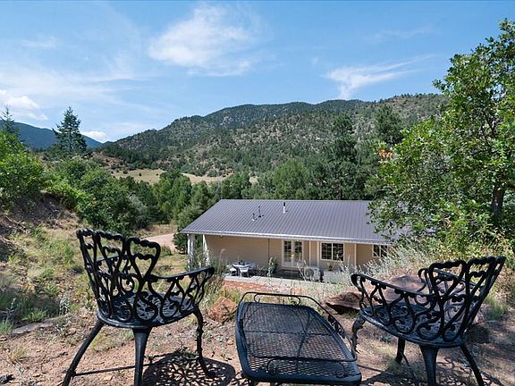 Wake up to the sound of Hardscrabble Creek flowing just beyond your front door & end the day watching the sun set behind the mountains from your favorite spot on the property, a quiet overlook known as “the perch.” This updated 2004 mountain home offers rare privacy with thousands of acres of BLM land out front & direct access to the San Isabel National Forest out back. The setting is peaceful & remote, but access is easy with a paved state highway & no long gravel roads. The home feels fresh and modern with a long list of recent updates including a brand new metal roof, new siding, interior and exterior paint, updated light fixtures throughout, new barn doors, and upgraded kitchen and bathroom finishes. The layout is comfortable with spacious bedrooms, a bright and open living area, and an efficient heating system powered by a high-efficiency boiler with hot water baseboard heat. A flexible bonus space serves perfectly as a home office with reliable high-speed Internet or could function as a non-conforming 4th bedroom. Every room in the home offers a view—whether it's the surrounding rock features or mountain peaks—creating a constant connection to the landscape. A split A/C unit and cool evening mountain breezes keep the home comfortable in the summer. The oversized garage is finished, climate controlled, and perfect for storage, projects, or gear. Step out back to a full-length covered patio that offers privacy, shade, and a quiet place to relax or entertain.