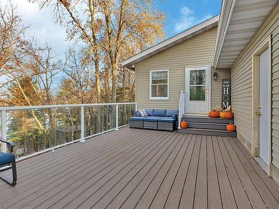 Embrace lake life on the Horseshoe Chain of Lakes, featuring 15 connected lakes, with this exceptional property on Horseshoe Lake. The spacious kitchen boasts wrap-around cabinets, stainless steel appliances, and a copper sink, all opening to the dining area and a large main-level family room with stunning lake views and a cozy gas fireplace. The primary suite occupies its own wing, complete with a private bath and walk-in closet. Convenient main-level laundry adds to the ease of living. The lower level features a generous family room, a third bedroom, and a full bath, with additional potential in the unfinished space, perfect for storage or a workshop. Outside, enjoy a maintenance-free lakeside deck with stairs or a driving path leading to the lake. The level lakeside area offers 90 feet of lake frontage with panoramic views. The fenced backyard provides privacy and includes another maintenance-free deck, perfect for relaxing or outdoor play. The insulated garage completes this perfect lakeside retreat! Dock included.