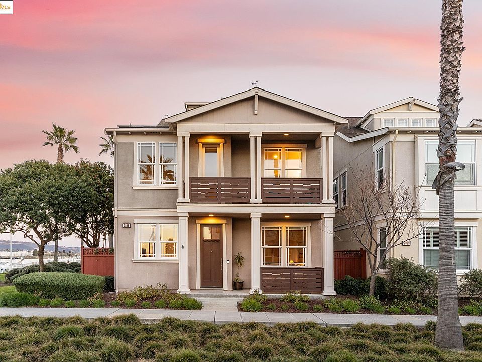 Welcome to 2086 Hibbard St, a stunning tri-level home located steps from the Alameda waterfront. Built in 2011, this spacious Grand Marina home exudes luxury and functionality with stylish fixtures and finishes throughout. The main level showcases elegant box-beam ceilings and an open concept floor plan w/ gorgeous chef’s kitchen, island w/seating, bar area, wine fridge, custom pantry. Beautifully-designed patio w/seating, established plants, bubbling fountain, and lighting. The 2nd floor features a primary suite with en-suite bathroom, walk-in closet, sunken tub, balcony, and stunning marina views from all windows; 2 add’l BR, media room, bathroom w/ hydrotherapy walk-in jacuzzi tub and laundry complete this floor. The bright and sunny top floor offers a large flex-space with full bath, perfect for guest suite, home office or family/game room, with expansive marina + city views. A/C, solar panels w/battery backup means you are prepared for all types of weather. Out the door you will find the greenbelt where you can enjoy strolling or rolling or along the water, then head to Mosley’s Cafe for breakfast or happy hour with friends. Near Park St / South Shore shops + dining, and easy access to off-island commuting including the SF Ferry terminal, express bus to SF, Park St Bridge.