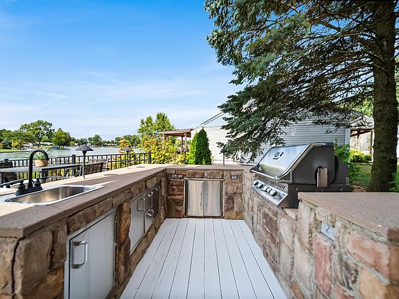 Welcome to one of Choctaw Lake's most iconic homes and a true standout in both style and setting. Nestled directly on the water, this stunning three-story retreat offers 3,700 square feet of beautifully designed space with four bedrooms plus a den/office (or a possible fifth bedroom) and three-and-a-half baths. The home captures attention with its striking presence and charm, inviting you to step into a lifestyle that feels like vacation every day. Being sold fully furnished, boat & lake toys included, this is a rare opportunity to enjoy lake living from day one. Sunlit interiors open to panoramic water views, while spacious gathering areas create the perfect backdrop for quiet moments & lively entertaining. Step outside to your private paradise featuring a sparkling pool with spillover spa, outdoor kitchenette, and take in breathtaking sunsets over the water on one of the two wraparound decks. The 3-car garage and storage shed ensure plenty of space for all your gear and adventures. Whether you're seeking a year-round residence or the ultimate weekend escape, this property offers the best of both worlds: luxury, leisure, and the magic of lakefront living.