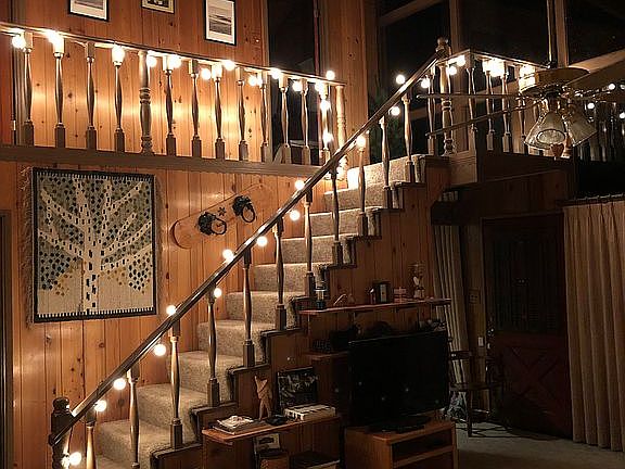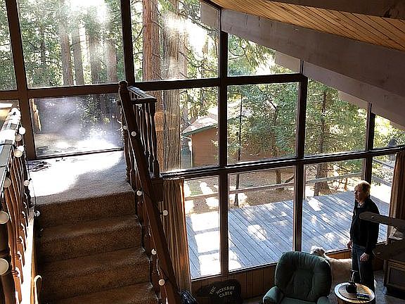 Architect design mid century cabin. Quality construction and details. Wood finishes inside. Large vaulted family room with wall of glass overlooking large deck and wooded lot with mature evergreen trees.