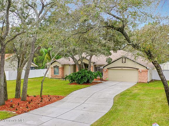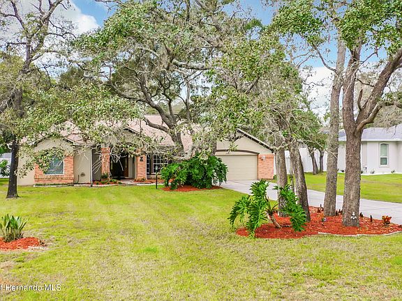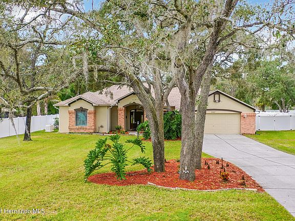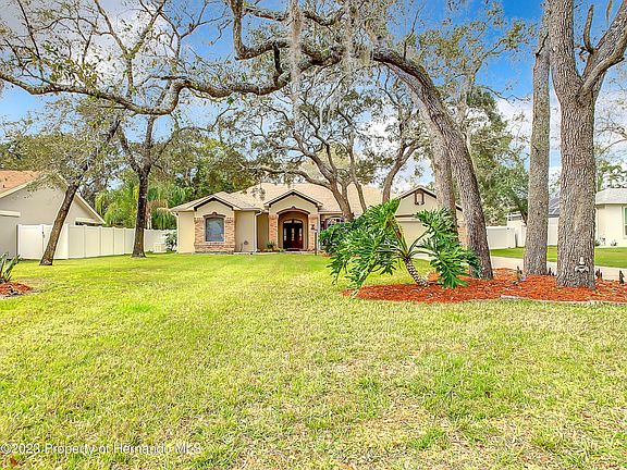 Gorgeous and recently updated. Amazing opportunity with this 3 bedroom, 2 bath solar heated pool home that sits on a beautiful almost ¾ acre property located in the heart of Spring Hill. As you drive up you will be greeted with a charming brick faced front entrance, beautiful oak trees and an impressive front yard. Stunning double door entry leads to a beautiful front tiled entrance and formal dining area with soaring ceilings, bay windows with plantation shutters. The separate family room features brand new plank tile floor and lovely tray ceilings. Indulge in absolute elegance as you explore this completely remodeled gourmet kitchen featuring custom Brookwood cabinets, stunning granite counters, stainless steel appliances with double oven...upper is convection, brand new Bosch dishwasher and plank tile flooring. Impressive huge cooking island with sink, newer touchless faucet and an induction cooktop equipped with stylish exhaust hood. The warm and cozy living room features beautiful pool and backyard views, has plank tile flooring, built-in glass shelves/mirror and surround sound. The master bedroom is generous in size and offers 2 huge walk-in closets (1 offers custom shelving) and sliders that lead to the pool. Large master bath with beautiful decorative window, electric blind, jetted tub, a snail shower with steam shower head and updated tile. 2nd bedroom has laminate flooring, 3rd bedroom has plank tile floors and a bay window. There is even an office nook area with plank tile flooring. Enjoy a dedicated laundry room with washer & dryer. Step out into the screen enclosed lanai where you can relax & enjoy the beauty and serenity by the diamond brite pool that overlooks the nicely landscaped completely fenced yard. Other amazing features include AC 2022, Roof 2021, windows/door replaced in 2013, new interior paint, hurricane shutters, dual hot water heater, brand new pool pump with variable speed, new filter and solar control, new French drains, alarm system, whole house generator with propane 2021, Wi-Fi for sprinklers, 2 smoke detectors, nest thermostat, front door entry and ring doorbell and camera. Oversized 2 car garage with Wi-Fi garage door opener, tons of storage, shed stays for that extra storage and sprinklers on well. This home is perfect for entertaining, so come envision your new beginning while it's still available! NO HOA, NO CDD!! Close to the Suncoast parkway for quick access to the airport, Tampa, Clearwater and St. Pete Beaches (Ranked in the top 5 Beaches in the US), also close to the famous Tarpon Springs Sponge Docks. Conveniently located close to restaurants, shopping, schools, and hospitals.