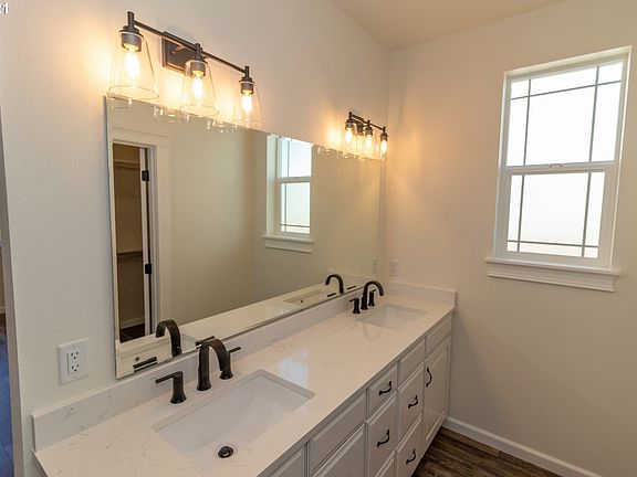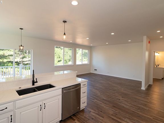 Brand New quality built home in Sandpines West. Features 9 ft ceilings throughout, open floor plan, large custom kitchen with soft pull cabinets, under cabinet lighting, quartz counter tops, eating bar, composite double sink, Moen black coated brass faucets, Whirlpool stainless steel appliances, rigid vinyl plank flooring, pendant & LED can lighting w/dimmers. Front & rear covered Trex decks, 40 yr roof, Milgard windows, fiber cement lap siding. Large southern exposure lot. Perfect!