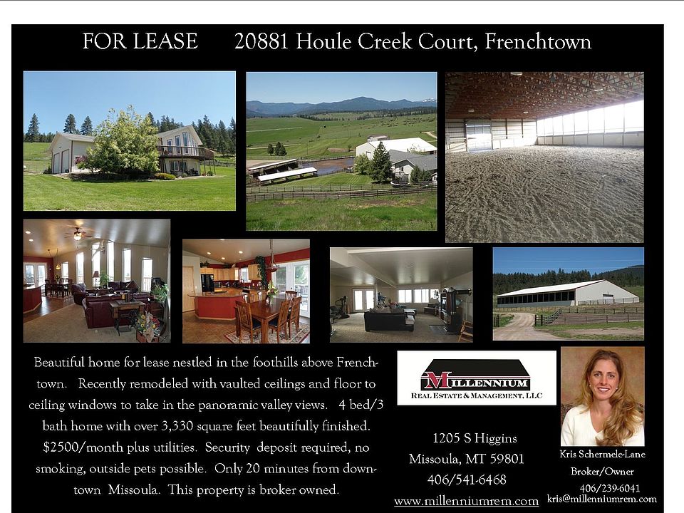 20881 Houle Creek Court, Frenchtown. This amazing horse property boasts stunning views of the Frenchtown Valley from every window, deck and both arenas. Call for your personal showing today Additional pet deposit may apply. Tenant pays utilities