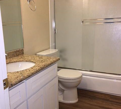 Beautiful two bedroom, one bathroom, new wood floors, granite kitchen counter tops. Gated community, two swimming pools and a fitness center. Resident pays Water, Sewer and Trash