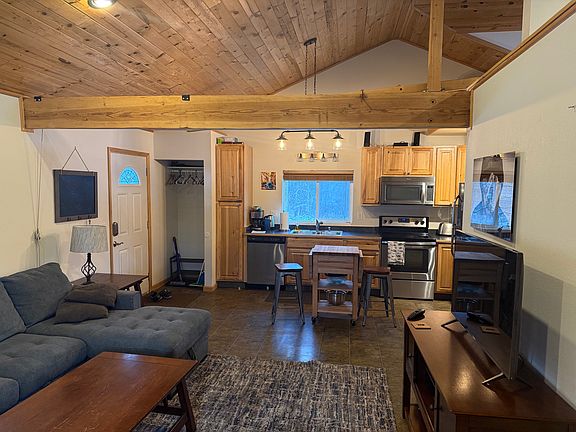 This is a fully furnished owners unit. No shared walls, stand alone unit above a garage. All utilities included except internet. Cathedral ceiling with a small loft. Washer and dryer in unit, all stainless appliances. Very cozy apartment.