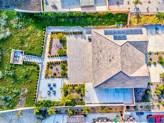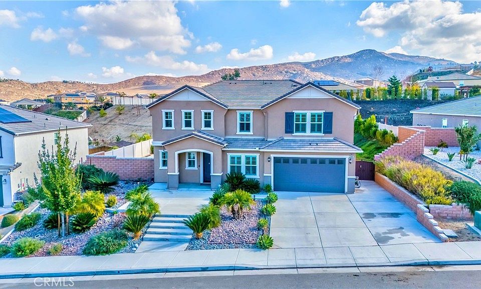 The entire house features premium vinyl plank flooring, energy-saving solar panels, plantation shutters, ceiling fans, recessed ceiling lights, and a Wi-Fi smart thermostat. The kitchen is a chef's dream with white thermofoil cabinetry, satin nickel knobs, granite countertops, a premium tiled backsplash, a large island with bar seating, and Whirlpool® stainless steel appliances. A spacious walk-in pantry offers ample storage. The bright living room provides views, while the versatile flex room can serve as a formal dining area or office. The airy and bright expansive great room is perfect for family gatherings. A bedroom and full bathroom on the main floor offer convenience for guests. The primary suite features a bright and spacious bedroom, a huge walk-in closet, a bathroom with a separate tub and walk-in shower, and double vanity sinks with cultured marble countertop. The large loft with picturesque views offers additional space for your family's needs. Three additional well-sized bedrooms and a full bathroom are located on the second level, along with a large laundry room with plenty of storage cabinets and shelves. The beautifully hardscaped and landscaped backyard is perfect for outdoor enjoyment and has the potential for an ADU. With no HOA fees and proximity to UCR, CBU, Historical Downtown Riverside, and Loma Linda University and Hospital, this home is a must-see!