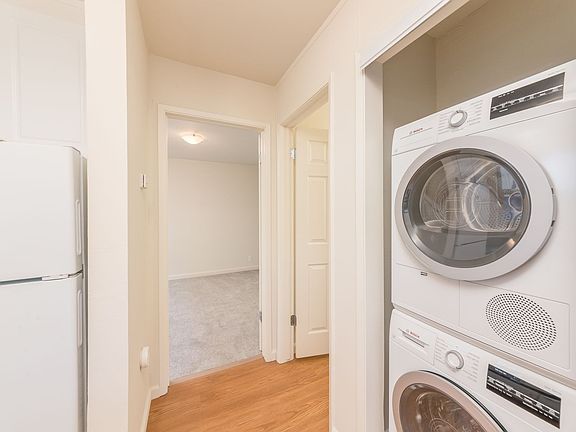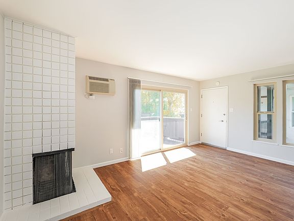 One bedroom, One bathroom apartment with large private balcony. Laminate flooring throughout, Carpet in bedroom, Washer/Dryer in unit. Granite counter tops in kitchen and bathroom. Air conditioning, dishwasher, disposal, large closets, cozy wood burning fireplace, assigned covered parking and plenty of guest parking.