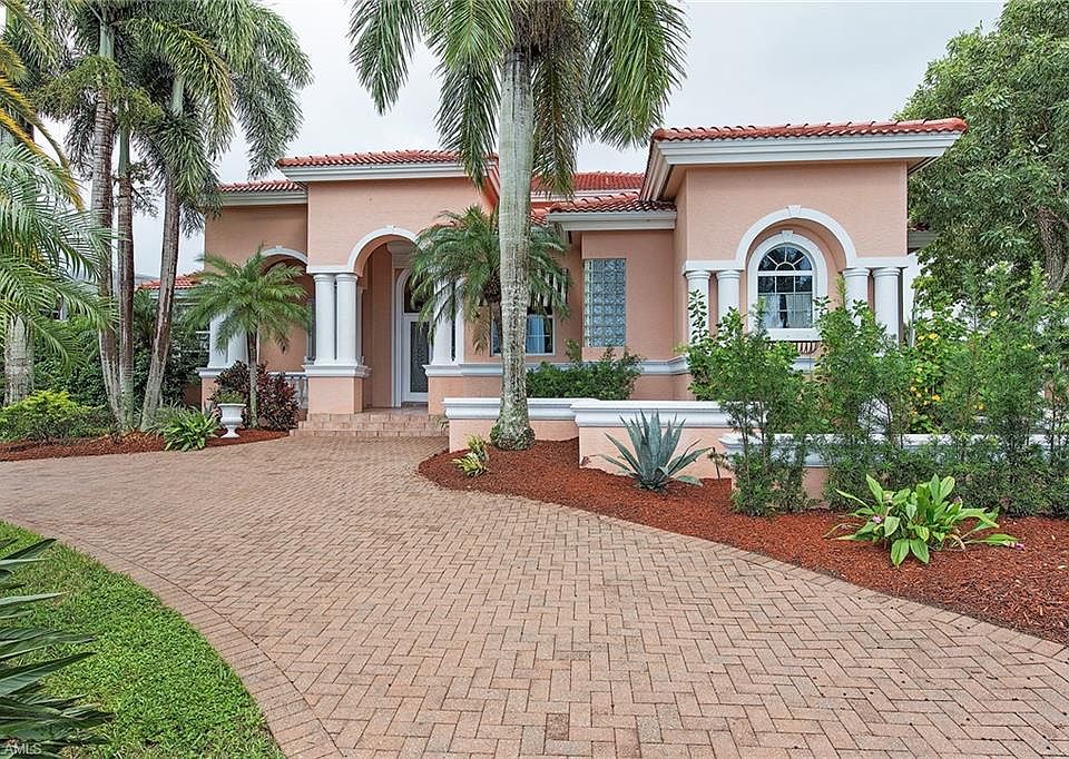 Wonderful Royal Harbor waterfront home. A circular paver drive leads to a covered entry, foyer, two-story living room and a formal dining room. Beautiful open kitchen with island/breakfast bar, custom cabinets, Thermador appliances and breakfast nook overlooking the large family room with sliding glass doors to the outdoor living area. 4 bedrooms + den, 3 full and 1 half bath. Heated pool/spa. Boat dock with lift. Large corner lot with additional side driveway and attached garage. New roof and pool cage in 2018.