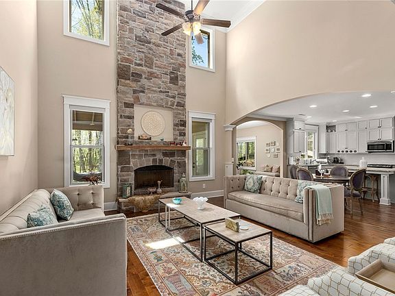 Stunning 5 BR, 3.5 BA home overlooking the woods and lake. This beauty boasts many upgraded features such as the gorgeous, beamed dining room ceiling, soaring 17ft stone fireplace in the living room, bright sunroom with breathtaking views as well as a side-entry garage. Outdoor open-rafter porch is perfect for sitting out enjoying the view or entertaining friends. The huge loft room upstairs is perfect for a den or playroom and the house has many areas with built-in shelving. The main-level primary bedroom is generously sized and has a wonderful bath and large walk-in closet with window. There is also a transferrable termite bond with Cook's. Has been recently appraised, professionally cleaned and carpets professionally stretched and cleaned. This gem is ready for its new owner so call your favorite agent today for a private showing!