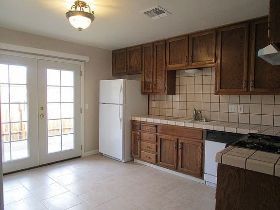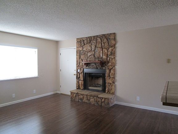 2 bedroom, 1 bathroom unit. Eat in kitchen with French doors to patio area and tile flooring. Living room has laminate faux wood flooring and stone fireplace. Carpet in bedrooms. Washer/Dryer hookups in garage. Quiet area. No shared walls, garages separate units. Garage door w/opener Evaporative cooling/forced air heating. Refrigerator provided but not warranted. Pest control services provided. Cats subject to owner approval limit 2. No Dogs.