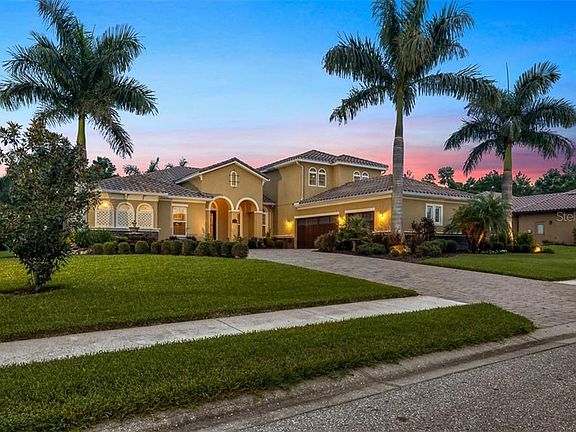 Classic Spanish architecture combines with elegant interior design and finishings for a stunning result in this showstopper 4 Bedroom, 3 Bath home with a den and bonus room in Rye Wilderness Estates. The entry makes such a first impression, even as you approach the home via the pavered driveway to the side-entry 3-car garage you will notice the quality and stateliness of the home! The custom glass panel door with wrought-iron detailing opens to soaring ceilings, gorgeous tile, and architectural columns. The open concept formal living spaces are beautifully detailed with crown molding, custom finishes, and tray ceilings with designer insets that set the tone of sophistication throughout the home. The kitchen is a dream, with rich, dark wood cabinetry, beautiful granite, stainless appliances, and a custom backsplash. The breakfast bar is open to the casual dining nook with aquarium glass window and family room and looks out to the outdoor living spaces. The owner's retreat is luxurious, with beautiful scraped wood floors and decorator finishes in the tray ceiling, and custom window treatments. The en-suite bath is your own spa, with dual vanities, a walk-in shower, and a garden tub. The secondary bedrooms are spacious, luxurious, and private. Stairs with a beautiful wood and iron railing lead to a massive bonus room that has limitless possibilities and features additional storage! Additional features of this home include upgraded lighting throughout, decorator finishes in all the tray ceilings, extensive crown molding, and luxury window treatments. Outdoor Florida living is at its best in this lush and serene setting, with expansive covered lanai spaces for multiple seating areas to enjoy the sparkling heated, Pebble Tec pool, with fountains. The view of the preserve includes beautiful tropical landscaping, swaying palms, and a lush green manicured lawn. Rye Wilderness Estates is perfectly located with close proximity to I-75 for access to area Shopping, Dining, and beaches!