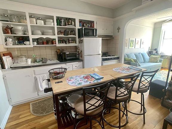 Renovated Sunny1 Bedroom on quiet street. This is a 2nd floor walkup. New hardwood floors, cool vintage kitchen cabinets, nice sized living and bedroom plus eat in kitchen with skylight. Sadly no pets.