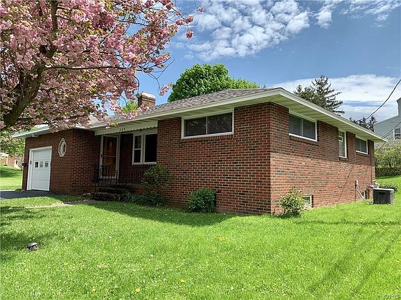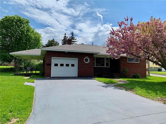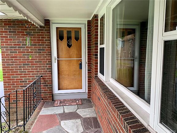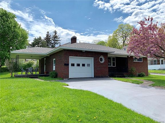 Well built all brick Ranch featuring front and side sitting porch and covered patio. Large front living room with stone faced wood burning fireplace, 3 nice size bedrooms, main bath with built-in sitting/makeup vanity & pedestal sink, hardwoods throughout, newer laminate floors in kitchen and hallway. Spacious eat-in kitchen with built-in wall oven and glass cook top. Large bright basement with 2nd brick faced wood-burning fireplace ready for future family room. Plumbing in place for future bath. Additional improvements include 200-amp electrical service, brand new roof to wood, updated appliances, replacement windows and a list of additional improvements -- all on a quiet corner lot and offering low cost Solvay Electric!