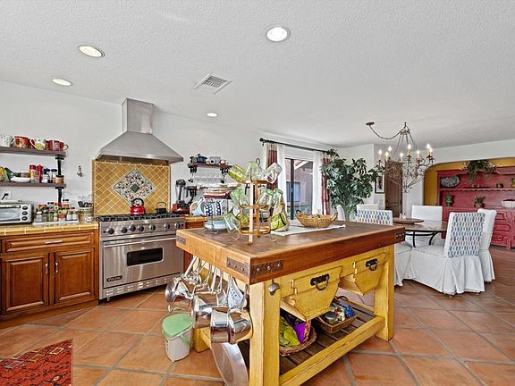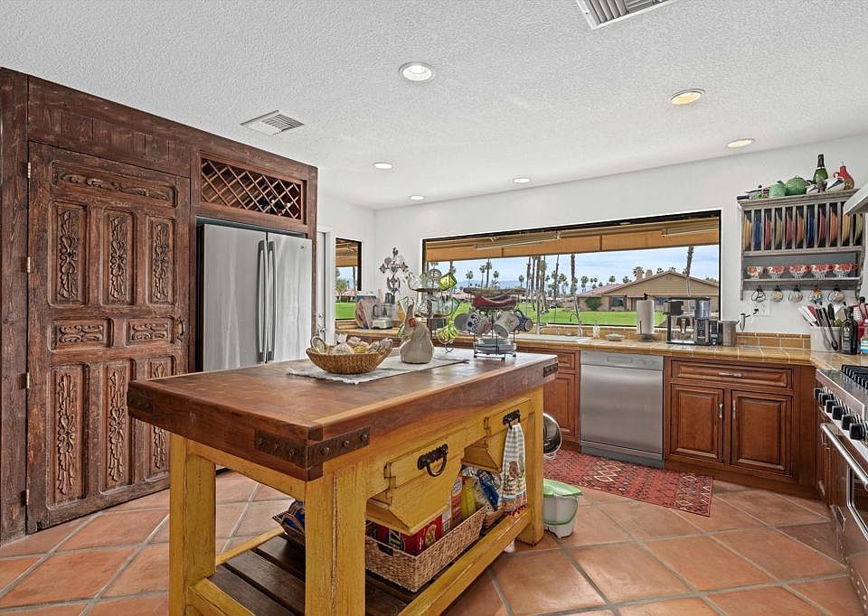 OPEN KITCHEN with big PICTURE WINDOW!!RAISED CEILINGS!3rd stall CART GARAGE!Uniquely decorated with a Spanish flair - saltillo tile looring throughout, mosaic tiled fireplace, red brick accent wall, beautiful hand-carved pieces throughout, mosaic lamp shades and more! STAINLESS APPLIANCES, cast iron tub in the Guest Bath, upgraded showers and bathroom counters, canned lighting throughout, granite counter top and sink in laundry area. EPOXY garage floor and dry-walled ceiling. VIEWS of 2 fairways and lakes from the enlarged patio with pony wall. Must see to really appreciate every detail.
