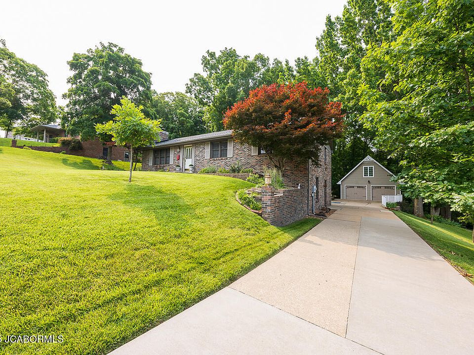 I dare you to find a better cared for home! New, New, new. Newly refinished hardwoods in the living room, dining room, and Kitchen, Beautiful cabinetry with solid surface counters. New maintenance free 20 x 14 deck with privacy fencing and pergola. 2 year old roof. New carpets in bedrooms on the main. Updated fixtures. Cove molding. 4 garages, three with openers. 2 electric fireplaces with remotes. Remote controlled black out shade to the deck. Huge family room and bedroom down and large living area in the detached garage. Tiled shower. Newer HVAC. Basketball goal and speaker system in the basement negotiable. Detached garage is plumbed for possible bath. Mature oak, hickory, redbud, dogwood, and elm trees. Smoketree and Raintree. Well cared for flower beds with lots of annuals. Bedroom down has a closet, but currently has no shelving. PEP waterproofing Warranty on work done in 2013.
