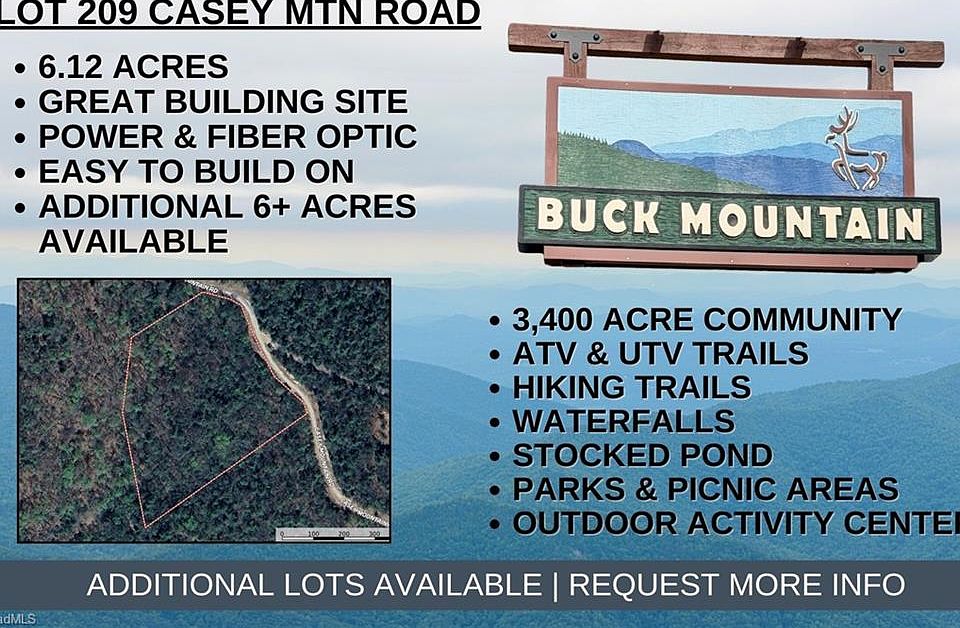 Looking to build a weekend getaway in the mountains? At 6.12 acres, Lot 209 offers a tranquil place to relax & enjoy nature. If additional acreage is what you’re after, adjoining Lot 213 (6+ acres) is also available (MLS#1182298). Just think of all the privacy & seclusion you’ll have here! MOUNTAIN VIEWS w/tree trimming. 2022 Survey. Corners marked. Electric available. FIBER OPTIC available. Previously perked for 3-bedroom septic. Long & short-term rentals allowed. Conveniently located in 3,400 acre Buck Mtn...ONLY GATED ATV COMMUNITY in Wilkes County. Arrive at the gate from Winston in only 1 hr & from Charlotte in 1 hr 40 min. Centrally located 35 min from Boone, West Jefferson & Wilkesboro. Close to BLUE RIDGE PKWY, ASU, shopping, dining, golf, wineries, breweries, mtn biking & skiing. BUCK MTN AMENITIES: ATV & Hiking Trails, Parks, Fishing Pond, Water Falls, Pavilions, Community Ctr, Helipad, Outdoor Activity Ctr. 1,400 SF min. NO TINY HOMES. NO MOBILE HOMES. NO SELLER FINANCING.