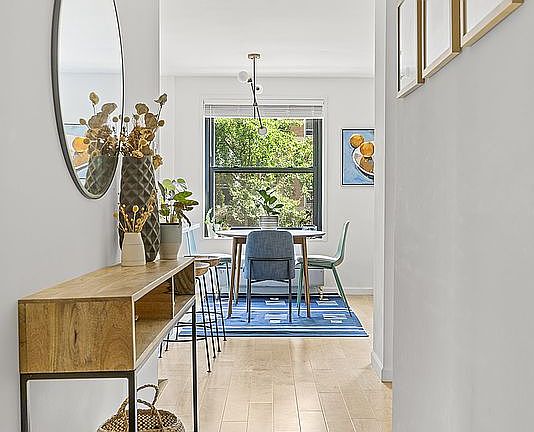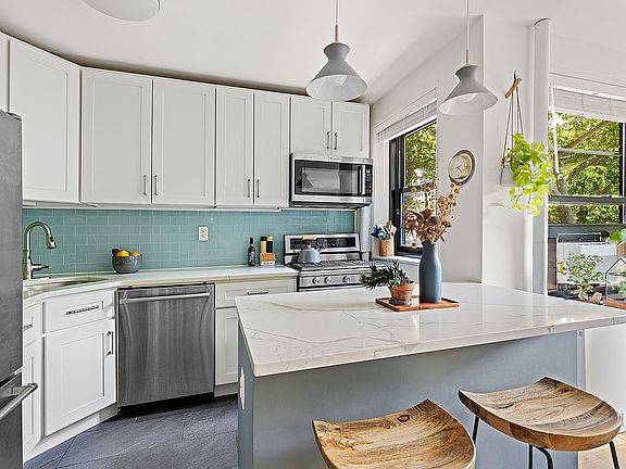 Renovated in 2021 and immaculately maintained, this spacious apartment boasts a smart and functional layout. The entry foyer has a generously sized closet big enough to keep all your winter coats in your apartment - year round! Walk in towards the windowed kitchen with abundant storage space, elegant and low-maintenance quartz countertops and modern white cabinetry. Stainless steel Bosch and Kitchenaid appliances, Moen touchless faucet, built-in Aquasana 3-stage water filtration and under cabinet lighting make meal prep a breeze. The apartment is bathed in sunlight throughout the day from oversized southern-facing windows, ideal for anyone with a green thumb.