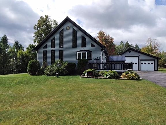 View this beautiful country home located on 1.5 acres of land. This 3-br. house offers 2.5 baths, master bedroom with bath, office area, bedroom and guest bathroom all on the first floor. Beautiful loft with views, gorgeous cathedral ceiling, two stories of windows allowing a lot of light & warmth. The skylight has solar operated window blinds. Front and side decks offer plenty of room for outdoor entertainment, landscaped, garden area with lots of privacy. The basement has a finished game room, laundry room, wood stove w/sitting area, work bench & utility room. Keep all your vehicles and toys in the three-car garage and tools in the workshop. This is a must see for anyone looking for a second home, retirement home or a spacious place to raise your family.