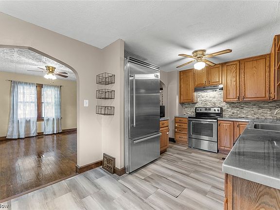 Don't miss out on this charming bungalow! With four bedrooms and a full bath. The original hardwood floors add a touch of character, while the spacious family room boasts a beautiful ceiling beam. The kitchen features newer cabinets, beautiful countertops, and stainless steel appliances (which are included). Additional storage can be found in the hallway built-ins. Enjoy the outdoors on the deck, which is just the right size for relaxing evenings. Another bonus is the vinyl fenced in yard. This home also offers a newer furnace and air conditioning system. The basement has been waterproofed by the previous owner. Washer & Dryer included! The roof and gutters are newer as well (2019). Two car detached garage (roof 2020) with extra storage space. Don't wait, this home is move-in ready!