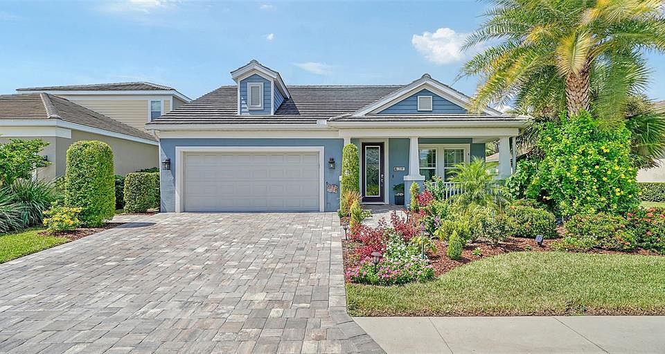 Don't miss out on this stunning home! From the moment you arrive at the paver driveway and step onto the extended front porch, you will know that you have found something special. Enter through the stylish designer glass front door to discover gorgeous wood flooring and exquisite coffered and tray ceilings throughout. This versatile den/media room opens up endless possibilities…whether you envision a music room with the baby grand piano, a cozy reading nook, or a bright office space. Adjacent are two spacious bedrooms, each with their own private bathroom. The large laundry room comes equipped with a second full-size refrigerator and a gas dryer, adding to your convenience. Do you love to entertain? Your family and friends will adore the expansive family room that seamlessly connects to the chef’s kitchen, featuring a massive island, granite countertops, stainless steel appliances, and a gas range. Enjoy pure drinking water with the reverse osmosis system and take advantage of the generous pantry and bright dining area with picturesque views of nature. The private primary suite at the back of the home boasts his and her closets, a serene reading area perfect for watching wildlife, and a luxurious bathroom with double sinks and a spacious walk-in shower. Step through the tinted triple-sliders to the incredible oversized lanai, where beautiful pavers surround a solar-heated saltwater pool. The lanai is stubbed for gas, ready for your outdoor gatherings, and features a new motorized 17-foot Sunsetter shade for your added comfort. Enjoy unparalleled privacy. Additional highlights include the solar heated pool, epoxy-coated garage with a workbench and utility sink, attic storage with an aluminum stairway, 7 ceiling fans, an ultraviolet air purifier in the A/C system, a gas water heater, and a radiant barrier in the attic which will lower your energy bills. This home is protected by gutters and hurricane shutters for peace of mind. The location, in the desirable Windwood community, a gated neighborhood, is just minutes from the new Sarasota Memorial Hospital, with Publix nearby and all the conveniences at your fingertips. Enjoy low HOA fees and no CDD. Act quickly as this gem will not last long!