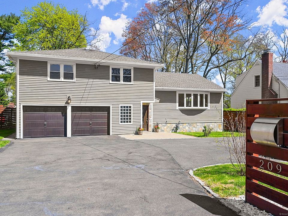 Modern flair meets vibrant living! Enchanting 3-bedroom Stone & Clapboard Contemporary Split, offering 4 glorious levels of living space to embrace. The main floor provides an open concept space, w/sundrenched living & dining rooms - both w/gleaming hardwood floors, and a large inviting eat-in-kitchen w/wood cabinetry, granite countertops & decorative tile backsplash. Just a few steps up are 3 generous BRs, including a primary w/direct access to the sumptuous full bath equipped w/a luxurious soaking tub, separate shower & attractive finishes. The ground level offers a spacious family room anchored by a dramatic fieldstone wood burning fireplace & French doors, a stunning remodeled full bath enveloped in tile w/radiant heated floors, a large entry foyer w/coat closet, laundry room and 2 car garage w/extra storage & interior access. The vintage inspired finished lower level is equipped w/a wet bar, built-in wine storage & billiards table (included in sale). A lush yard, cozy patio & chic privacy fencing create the perfect outdoor retreat. Located in the picturesque neighborhood of Glenbrook, on the Darien border, enjoy tree-lined streets w/sidewalks & the intimate feel of a small community while enjoying the ease of city life, close to train, I-95, an endless variety of restaurants & shopping, energizing recreation (Chelsea Piers Sports Center, golfing), cultural attractions (historic Palace Theatre, Stamford Museum), playground & dog park. Special home w/something for everyone Interior of home painted & wood floors refinished 2022, doors painted 2024. Hot water heater replaced 2023. Radon Air mitigation system installed 2024. Newer roof. Billiard table/equipment & bar stools are included in sale. Radiant heated flooring in ground floor bathroom. Dual zone Central A/C, natural gas, public water & sewer.