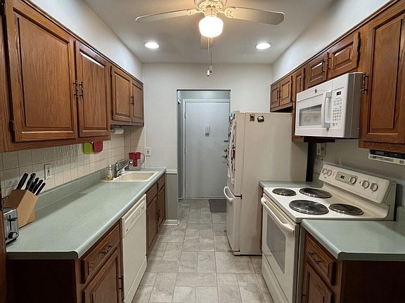 Kitchen features tiled backsplash and hi-hats. All appliances stay. Enclosed porch with faces beautiful treed location. Close to shopping and transportation