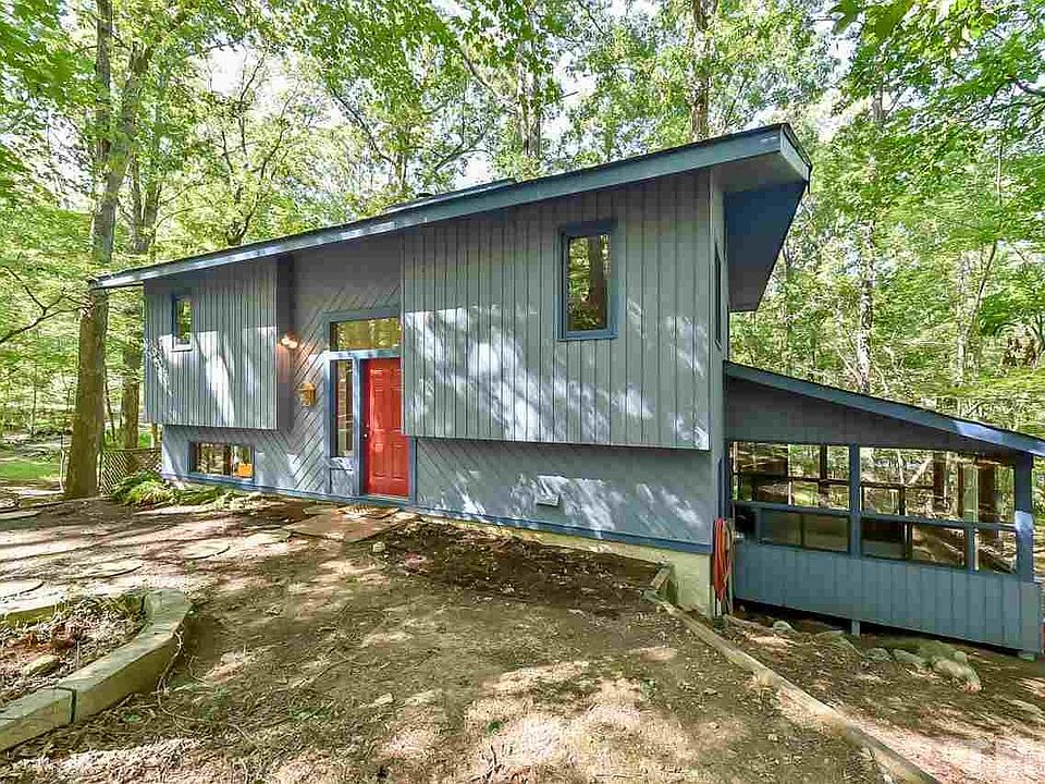 Home in the forest, well off road, filled with sunlight. Oak floors throughout augment the airy feel. Whole rear wall of glass overlooking full length deck & mature hardwoods. Large family room has wall of casement windows, bookcase and power circulating FP w slate hearth. Long dining room for flexible layout, open to kitchen. 3 Season Porch. BRs on upper floor graced by casement windows. Nice MBR suite. BR3/study. New paint. Graceful sharks mouth overhangs. Roof 2017. Clear areas up front with good sun.