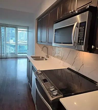 Spacious 616 sq.ft open concept 1 bed+den in the heart of downtown Toronto with parking end locker. This modern suite is located on 9 Th floor with large balcony facing west. Fully renovated bathroom, new quartz counter-top with under mount sink .New carpet in bedroom. Full access to all condo amenities: pool ,sauna gym, BBQ, Yoga end much more. Steps away from Lake Ontario Waterfront end parks. Walking distance to Sky -dome, TTC,Shops end restaurants. Coronation Park and The Bentway Across the street for dog owners. Stainless steel appliances. Hydro extra .Available from Sept 10 , 2024 . Price: $ 2300 with parking end locker. Extra locker $50.