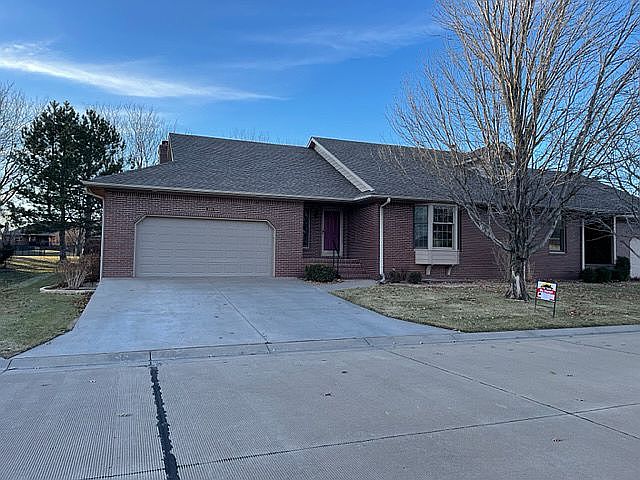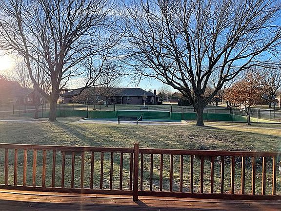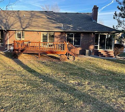 Custom brick ranch style home as part of a duplex. Featuring newer roof (2019), furnace (2019) and AC (2020). Gas log fireplace and a bright and sunny enclosed sun room. Quiet green space off the redwood deck featuring a private tennis court and sidewalk. Irrigated yard and lawn care included as part of HOA dues.