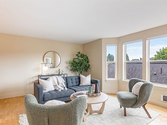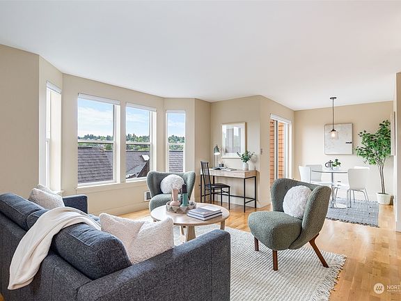 Charming top-floor condo in the heart of Fremont. Step inside to find gleaming hardwood floors, an open, light-filled layout, and captivating views from every room. The living area seamlessly flows into the dining and kitchen, allowing for effortless entertaining and comfortable everyday living. Freshly painted and newly carpeted, this residence combines modern updates with classic charm. The kitchen features s/s appliances, subway tile counters, & walnut cabinets—a serene bedroom with a custom closet system. In-unit w/d included. Situated along a tree-lined street, Vestalia offers secure entry and reserved garage parking, with a storage unit—steps to boutiques, coffee shops, pubs, restaurants, live music, and the Burke-Gilman Trail.
