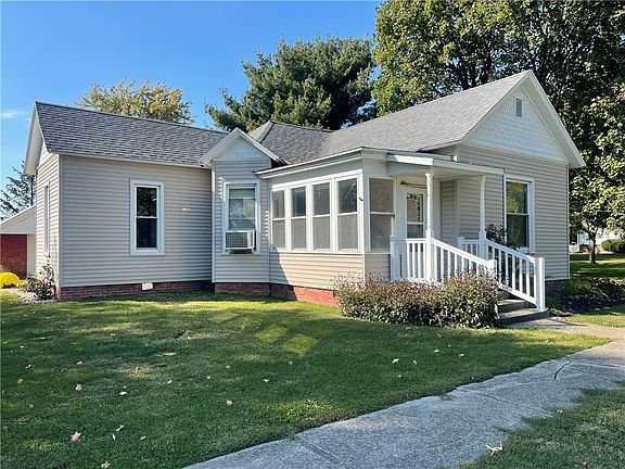 A touch of country feel at the edge of Brocton...3 bedroom, 1 bath vinyl-sided ranch home with replacement windows and more. GFA furnace and window AC. Plaster walls and wood floors through much with clean white kitchen. Updated bathroom with tub/shower combination. Enclosed front porch with unique stained glass door. Very nice covered side patio leading to the detached garage and additional buildings with fire pit area too. Make it a point to see this soon!!