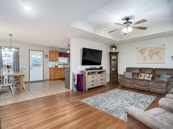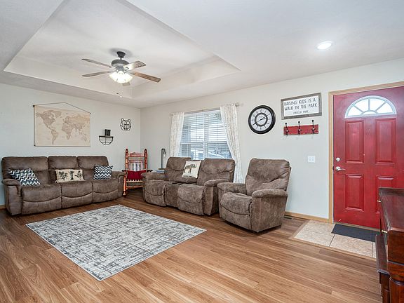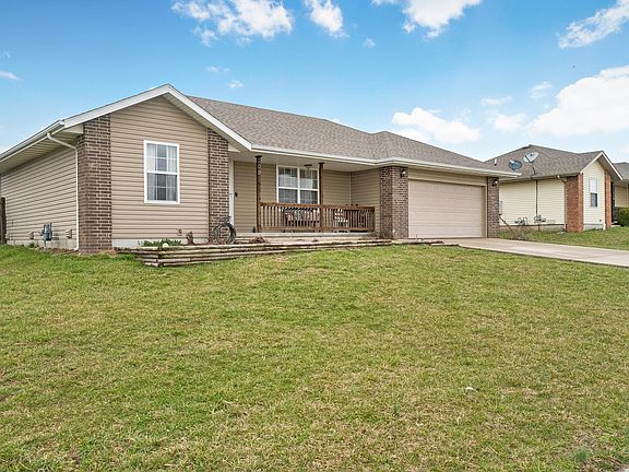 Come take a look at this adorable Clever home! 3 bedrooms 2 bathrooms with over 1300sqft. Vaulted ceilings in living room and master bedroom. Nice subway tile back splash in the kitchen. Double sinks and walk in closet in master bedroom. Huge privacy fenced back yard with shed. Covered front porch!