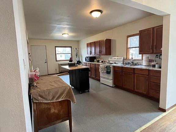 A home with two acres on the edge of town! This work-in-process three bedroom (one with no closet), one bath home with spacious kitchen, living and dining rooms offers so much potential! Step out the sliding door to a wood patio and covered firepit area where you can enjoy open views of the acreage and pasture to the east. Several garages and sheds come with the property, along with new siding and windows for the house.