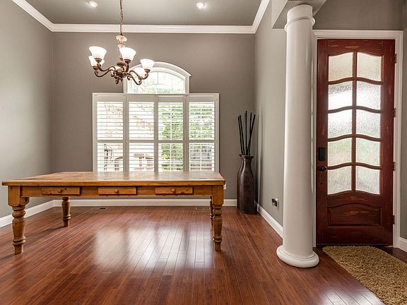 Beautiful home in popular Lake community! This 4 bedroom, 3 bath house features an inviting covered front porch, wood flooring, formal dining, large eat-in kitchen with granite & stainless appliances, cozy theater room, screened-in porch with fireplace perfect for entertaining, 10 x 12 storage shed, fenced in yard for the pups, immaculate garage & more! Popular lake community offers pool, fitness room & clubhouse!