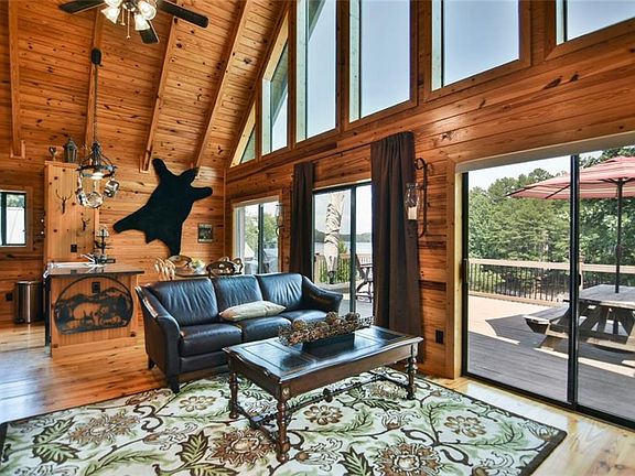 Welcome to your Lake Keowee Cottage located on excellent wide, water close to town with wonderful views including views of the Blue Ridge Mountains. This is the perfect rustic cottage with its detached garage. The main level features a fireplace with propane logs, pine floors, open floor plan with wood walls and wood, cathedral ceilings. Glass sliding doors lead to the deck constructed of composite material. The main level features the open living room, dining room, and kitchen plus two bedrooms and a full bath. The loft is this owner's master bedroom suite with a full bath and exceptional views of the mountains and Lake Keowee. The terrace level features a custom bar for entertaining constructed of natural hickory and a granite counter, Italian tile floor designed. This space is perfect for gathering as there is a full bath, the laundry and storage. Glass doors lead out to the covered porch which is below the main level deck. The owner constructed a stone patio leading to the covered dock on deep water. There are gutter helmets, an expanded deck, and power and water to the dock, rip-rap, and an irrigation system.