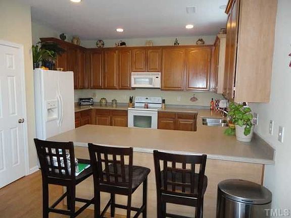 Perfect open, cheery plan! Laminate hardwoods throughout first floor, upgraded kitchen with solid surface countertops, breakfast bar, and tiled backsplash. Open DR with view of extended patio and landscaping. Huge MBR with large WIC and dual vanity bath. Large 2nd full bath too. Cul-de-sac street, pool and HSP park with walking trails/pond in n'hood. Conv. to Hwy 55 and new 540.
