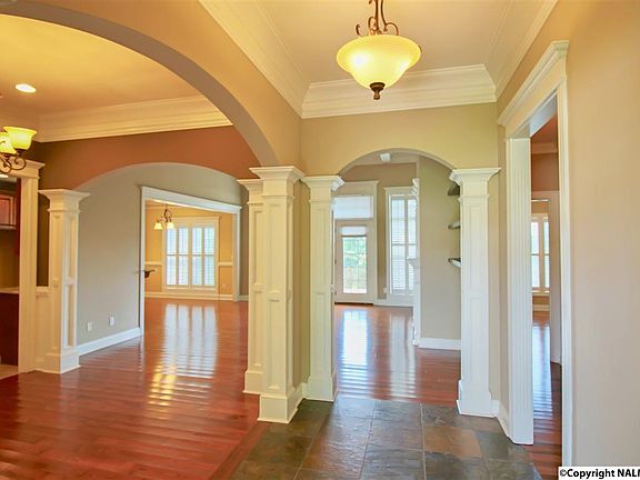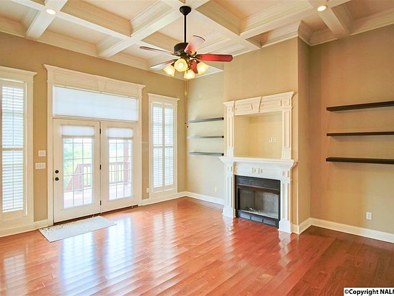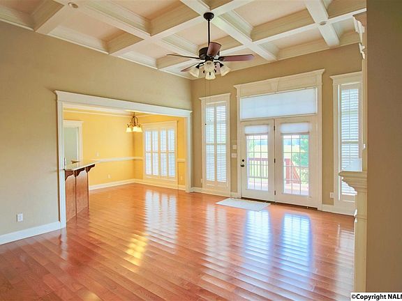 Open floor plan ranch style home convenient to Huntsville, Guntersville, and Scottsboro. Beautiful coffered ceiling in living room as well as hardwoods, heavy crown moldings, and a gas log fireplace. All windows have been fitted with new plantation shutters. Kitchen has been upgraded with new lighter granite countertops and a lovely backsplash. Master suite has a vaulted ceiling, walk in closet, dual vanity, and a nice tile shower plus a jetted tub. Back deck is covered to enjoy beautiful evening views of the neighbors pond or take in gorgeous sunrises as the deck faces east. 8 person storm shelter in the floor of the 2 car attached garage. Just 3 miles from local K-12 school at D.A.R.