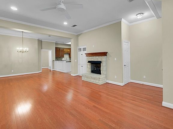 Easy living in desirable Pecan Village neighborhood. This well maintained one story, 2 bedroom, 2 bath townhome offers a spacious living room with beautiful hardwood floors, gas log fireplace with remote control, ceiling fan with remote control, recessed lighting, high ceilings and plantation shutters. Dining area is open to the living and kitchen for convenient entertaining. Kitchen has lovely granite counter tops, tile floors, range, dishwasher, disposal, kitchen faucet water filtration system, pantry and eat at bar. Office, computer nook with built in desk and file drawers, is off kitchen. The primary suite has tray ceiling, plantation shutters, walk in closet and access to the manicured backyard. Primary bath has a separate tub and shower and the guest bath has a tub and shower combo. Laundry room has good storage space. Crown molding throughout. Two car garage. HOA covers front and backyard mowing and sprinkler system, exterior maintenance and insurance. Roof recently replaced in 2025, fenced recently replaced and exterior and interior recently painted. $309,000