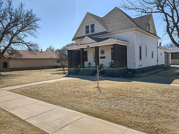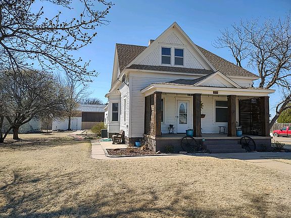 4 bed 2 bath Victorian Style Cottage sitting on a quiet corner lot . Covered porch and attached garage. This home has character from top to bottom! Walking through the front door you enter a large living room with an entertainment/office connected through French doors. The many large windows allow for natural light throughout the home and add to the charm. Off of the living room is a true cottage kitchen with cabinets and cupboards reaching from the ceiling to floor. Stainless steel refrigerator and stove. Large mud room/ laundry room with access to the attached garage. Two bedrooms are on the main level as well as both bathrooms. The other two bedrooms are upstairs. As you go up the staircase you reach another living area right off of the upstairs bedrooms. Perfect for an entertainment area for children! Unfinished basement. Outside you have a large lot with landscaping already done. Also on the property is another garden shed for extra storage. This home couldn't be in a quieter neighborhood. Located in Fowler, KS. 10 min from Meade. 10 min from Minneola. 30 min to Dodge. (Most furniture can be included in purchase.)