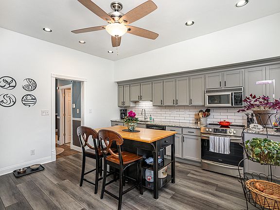 - Description: Island is wood; 10ft Ceilings; floors are waterproof; chairs stay with Island