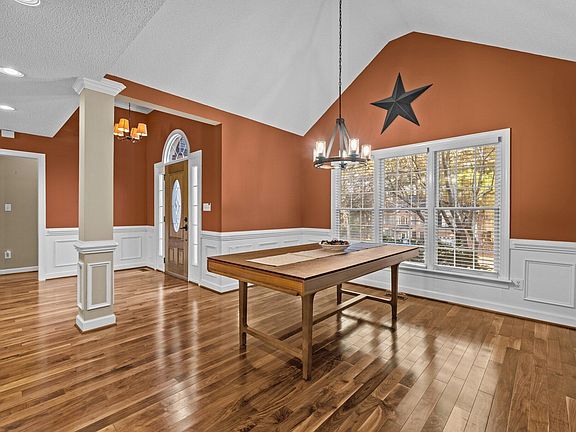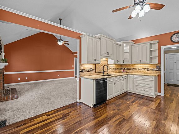 Spacious brick front ranch with side entry 2 car garage. Open floorplan with high ceilings in many rooms, updated wood floors (2018), and updated kitchen (2018) including newer cabinets, appliances (gas range), granite countertops and tile backsplash. Large living room has chairrail molding and a wood burning fireplace. All bedrooms are large and have wood shelving in the closets. The primary bedroom has a decorative accent wall and a barn door into the bathroom. The primary bathroom has a double vanity, separate tub and shower, water closet and a large walk-in closet. Laundry room with shelving. Outside has a partially covered deck, large side yard and storage shed. The concrete driveway has been extended - there is plenty of room to park a camper or several vehicles. Other updates include roof 2019, water heater 2018, heat pump 2018.