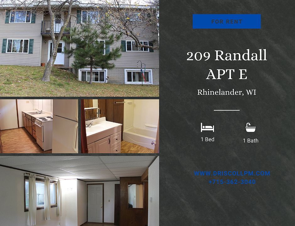 209 E Randall Apt E | $600 month + $600 SD Close to downtown Rhinelander Large 1 bedroom 1 huge bathroom with walk in closet Tenant pays electric (heat is electric) Coin operated washer and dryer in building No Animals No Smoking To view this property, submit your Rental Application(s) (one for each person 18 or older). Applications can be submitted online on our website or through Zillow. This listing is managed by Driscoll Property Management.
