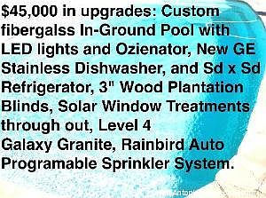 Very Nice, MANY Added UPGRADE, See list of amenities in Additnl docs: approx $45,000. BACKS UP TO Green Belt, "CUSTOM In-gr Pool" , 4 SIDES BRK, ENLARGED PATIO 40' x 28', blck Grade 4 Granite. NEW GE Dishwasher, and SS sd X sd Refridg. Tile, Auto Sprnklrs Systm, Delx Alarm System w/4 Fobs, SOLAR WINDOW TREATMENTS Throughout. ENERGY STAR CERTIF Builder, Custom 3'' Wd Plantatn Blnds,5 Yr Slab WARRANTY , 12 MTH Extd ,Home/POOL Warranty, 2 Cmmnty Prks,AWESOME VALUE, Appraisal $199,000 in May. ALL ROOMS UPSTAIRS