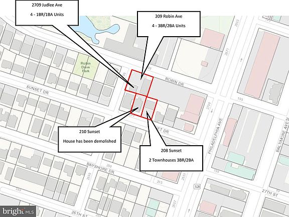 This property centrally located on 27th and 28th Streets, one block off Coastal Highway consists of 4 parcels. The condo buildings located on Robin Drive include 2 separate buildings. One features four 1 bedroom 1 bath condos that are currently rented monthly on a 6-12 month basis. The back building features four 3 bedroom 2 bath units which are rented seasonally.The duplex located at 208 Sunset Dr features two townhomes with 3 bedrooms and 2 full baths in each. 210 Sunset Dr is currently a residential lot which is used for overflow parking but has potential for building a single family home or duplex. Rental income, survey and utility cost can be provided upon request. These properties are sold as is.
