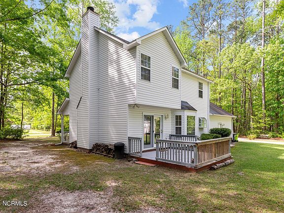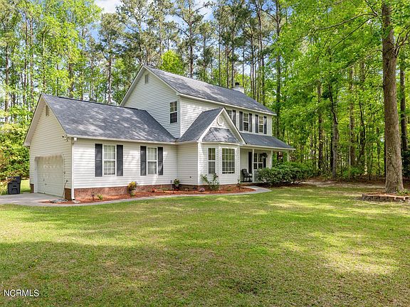 Sweetest home has been lovingly maintained and is ready for new owners. Set on private .88 Acre lot in the beautiful Cherry Branch West community, this is convenient to MCAS, about 30 minutes to the Carolina Coast Beaches and about 30 minutes from Historic New Bern. This is a traditional two story home with all bedrooms on 2nd level. Enter to center hallway with dining room to left and huge living room with wood-burning fireplace to the right. Kitchen is on the back side of the home and there is a first floor powder room for convenience. Upstairs find a sizeable master bedroom with onsuite bath and large closet. A hall bath serves the 2nd and 3rd bedrooms. The entire home except for bathrooms has laminate floors and there are two custom carpets in upstairs hall that convey. Spacious two car garage houses the laundry area and washer and dryer convey. Step outside to deck with and views of your open lot that is bordered by trees for privacy. Plenty of room in driveway for trailer or boat. Storage building is a handy and attractive feature to this back yard. Public water for home. Existing well serves outdoor spigot. NEW 15 SEER HVAC SYSTEM IN 2023 AND POLYBUTELYNE PIPE REPLACED IN 2022. Cherry Branch is a 450 acre waterfront community ten minutes from Cherry Branch Marine Corps Air Station. Amenities include swimming pool, tennis and basketball courts, beach access, community center and horse barn. See cherrybranchhoa.net for pictures and more information on amenities. Don't miss this unique opportunity.