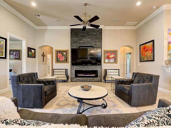 Welcome to your dream home backing up to the prestigious Oak Tree Golf Course! This meticulously kept residence is a masterpiece of luxury and functionality, boasting impeccable craftsmanship and stunning features throughout. Situated on 1-1/2 lots on a tranquil cul-de-sac, this home's exterior presents a seamless blend of brick and stone, epitomizing timeless elegance. Step inside and be captivated by the expansive great room, highlighted by a handsome stone fireplace and an impressive wet bar that's perfect for entertaining. The bar features glass shelving, an ice maker, and an oversized wine fridge, making it a focal point of the home's entertainment space. Designed with the discerning chef in mind, the kitchen is equipped with a large center island, stainless steel appliances including an induction cooktop, a pot filler + a giant walk-in pantry. The adjacent breakfast nook with bench seating offers stylish comfort & additional storage. The primary suite is a sanctuary of luxury, featuring a spacious bedroom, designer tile, double vanities, an oversized walk-in shower, + a separate freestanding tub. His and her closets with custom built-ins, and the connected laundry room offers convenience and functionality. Upstairs, two spacious secondary bedrooms each boast private bathrooms and a balcony overlooking the golf course and pond, providing a serene retreat for guests or family members. Additional highlights include a heated and cooled sunroom with picturesque views, an open patio for outdoor grilling and entertaining, and a huge office or den with built-in window seating. Living in Oak Tree grants you exclusive access to world-class amenities such as golf courses, tennis courts, a fitness center, fine dining, and social events at the prestigious clubhouse. Whole house generator + above-ground storm shelter! Don't miss your chance to own this exceptional property. Schedule your private tour today and experience the epitome of luxury living!
