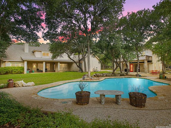 Discover Hill Country living on 5 acres with NO HOA in Boerne! Charming farmhouse-style 3415 SF Main Home paired with a private 1783 SF Guest House-ideal for multi-generational living, a detached office, or income opportunity! The main residence offers 5 spacious bedrooms, 2.5 baths including a unique Jack & Jill, and an inviting kitchen with island, custom cabinetry, and abundant storage that flows into open dining and living spaces. The primary retreat features a spa-inspired bath with double custom vanities and oversized shower. Step outside to a private backyard oasis featuring a sparkling pool, covered patio, and expansive space beneath mature shade trees-perfect for relaxing or entertaining. The guest house adds nearly 1,800 SF with its own entry, 2 living areas, 1.5 baths, and endless versatility. Property also includes an enclosed animal pen for chickens, goats, or 4H/FFA projects. Just beyond the fence, discover level acreage with a deer feeder and seasonal creek. All this within Boerne ISD and minutes from I-10, La Cantera, The Rim, and Historic Downtown Boerne.
